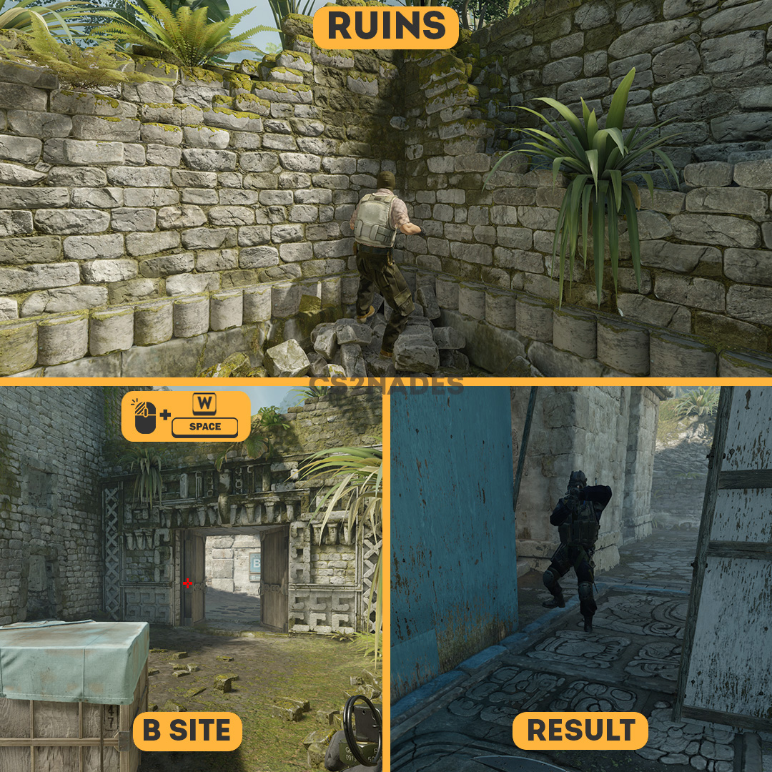 This flash lineup from Ruins flashes B site 2 on Ancient in CS2. On T side, use this flash to entry-frag or support a teammate pushing into position. The throw uses a left-click + W + jump technique, so practice the position and timing in a private server before your match. Includes crosshair placement, video guide, and setpos command.