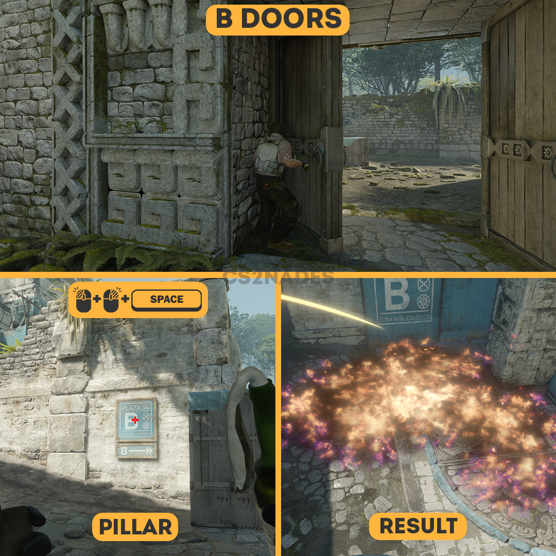 This molotov lineup from B Doors burns out pillar on Ancient in CS2. For T-side plays, this molotov clears common defensive positions and forces rotations. The throw uses a left+right click + jump technique, so practice the position and timing in a private server before your match. Includes crosshair placement, video guide, and setpos command.