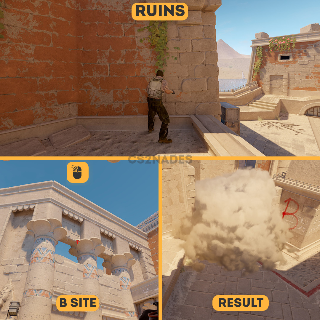 This smoke lineup from Ruins cuts off sightlines at B site on Anubis in CS2. This is a strong T-side lineup for site executes — it cuts off key sightlines and lets your team push without being spotted. The throw uses a left-click technique, so practice the position and timing in a private server before your match. Includes crosshair placement, video guide, and setpos command.