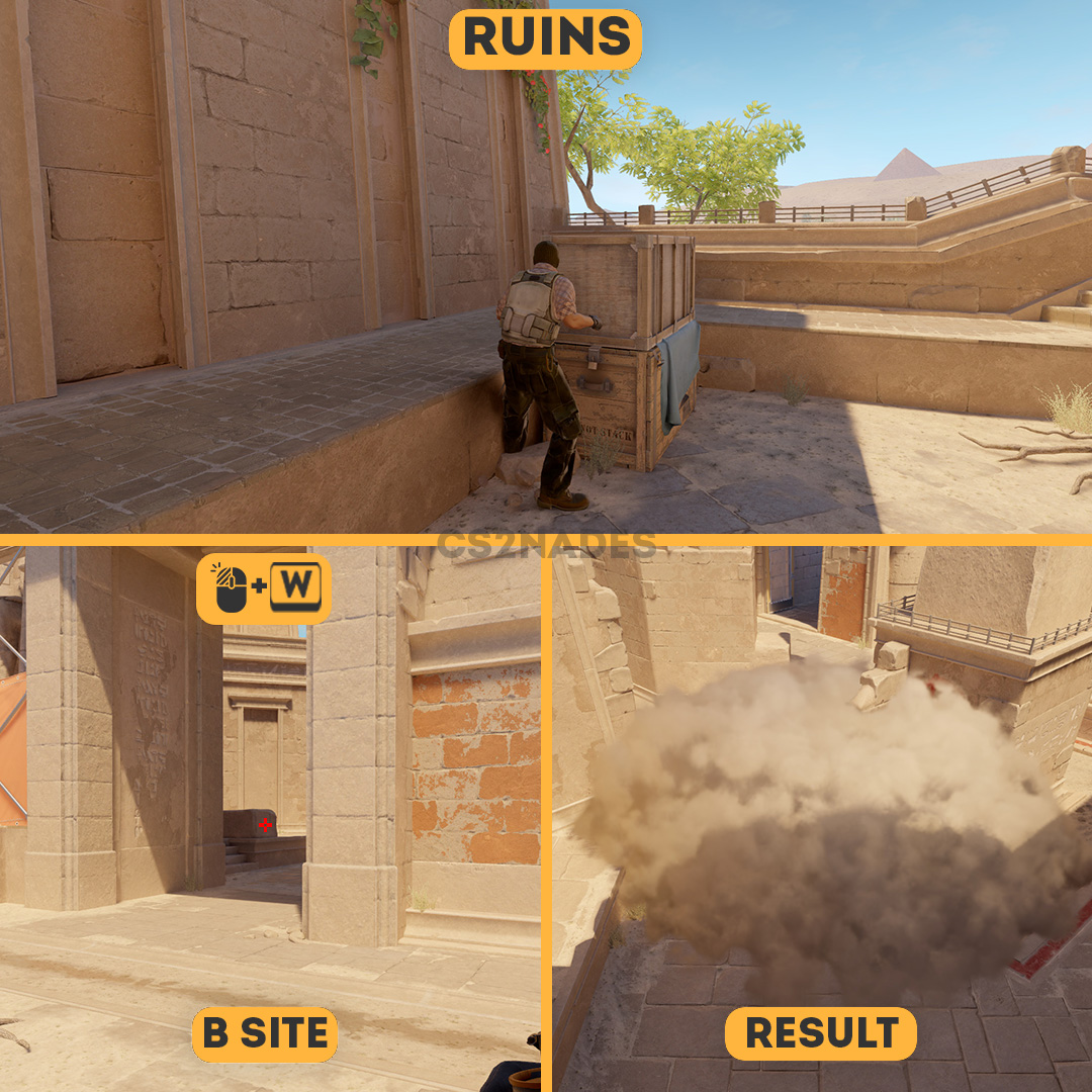 This smoke lineup from Ruins denies the angle at B site 7 on Anubis in CS2. This is a strong T-side lineup for site executes — it cuts off key sightlines and lets your team push without being spotted. The throw uses a running throw technique, so practice the position and timing in a private server before your match. Includes crosshair placement, video guide, and setpos command.