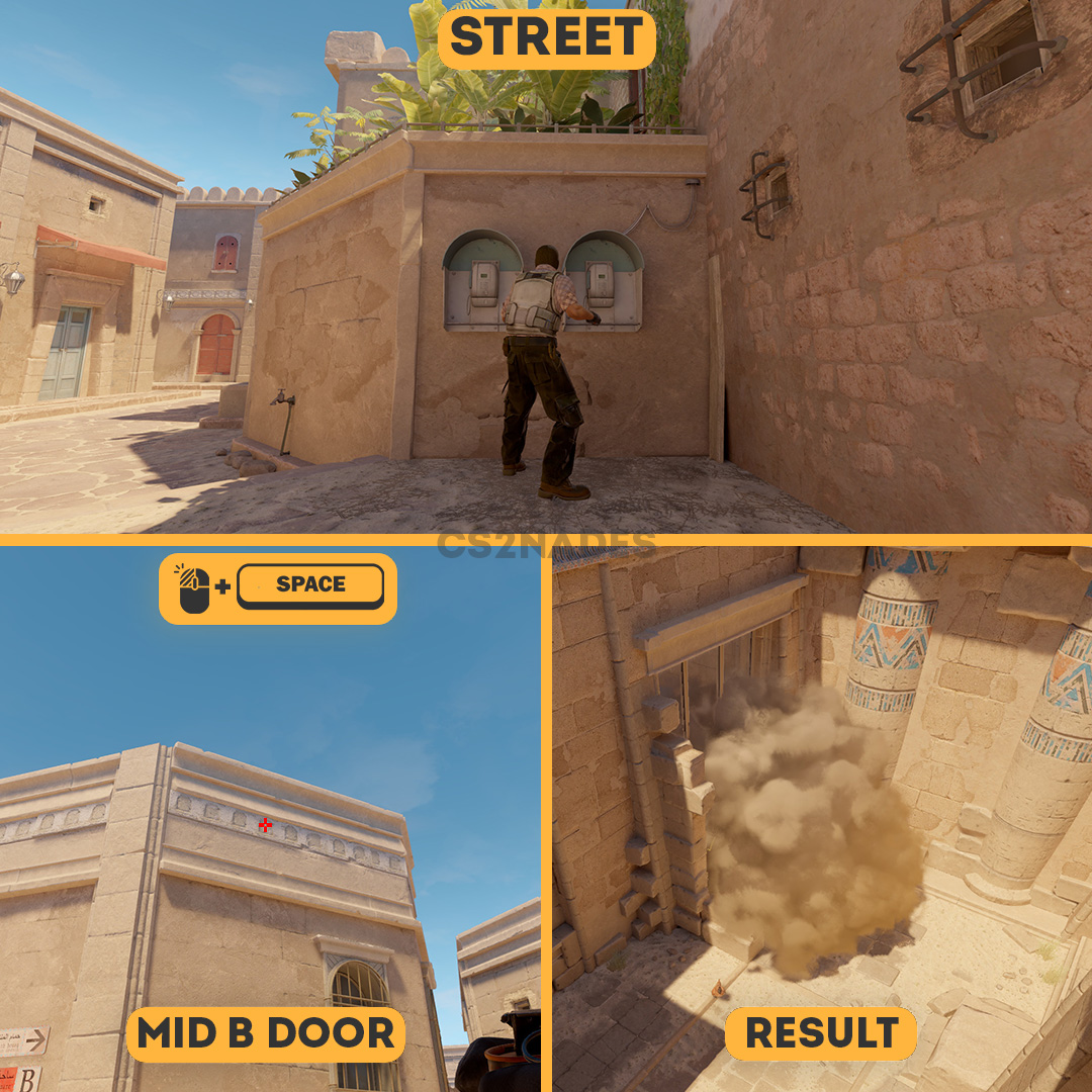 This smoke lineup from Street covers mid B door on Anubis in CS2. This is a strong T-side lineup for site executes — it cuts off key sightlines and lets your team push without being spotted. The throw uses a left-click + jump technique, so practice the position and timing in a private server before your match. Includes crosshair placement, video guide, and setpos command.