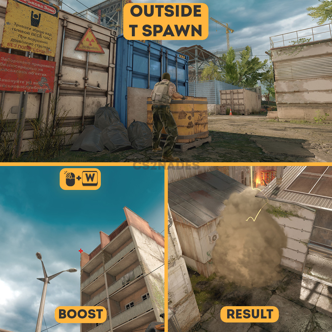 Смок с Outside T Spawn на Boost на карте Кэш помогает перекрыть Boost и убрать опасный угол при розыгрыше мида. Полезно для выходов, сплитов и стандартного контроля карты.