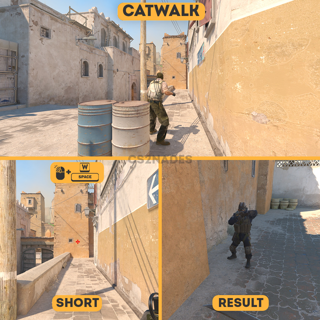 This flash lineup from Catwalk blinds defenders at short 2 on Dust2 in CS2. On T side, use this flash to entry-frag or support a teammate pushing into position. The throw uses a left-click + W + jump technique, so practice the position and timing in a private server before your match. Includes crosshair placement, video guide, and setpos command.