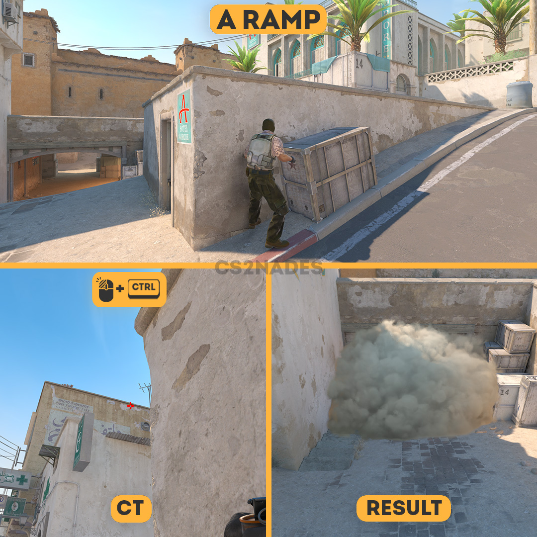 This smoke lineup from A Ramp denies the angle at CT 4 on Dust2 in CS2. This is a strong T-side lineup for site executes — it cuts off key sightlines and lets your team push without being spotted. The throw uses a left-click + crouch technique, so practice the position and timing in a private server before your match. Includes crosshair placement, video guide, and setpos command.