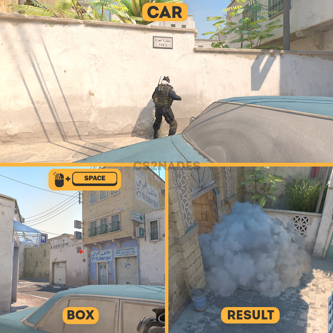 This smoke lineup from Car covers box on Dust2 in CS2. On CT side, this smoke helps hold the site by cutting off key approach angles. The throw uses a left-click + jump technique, so practice the position and timing in a private server before your match. Includes crosshair placement, video guide, and setpos command.