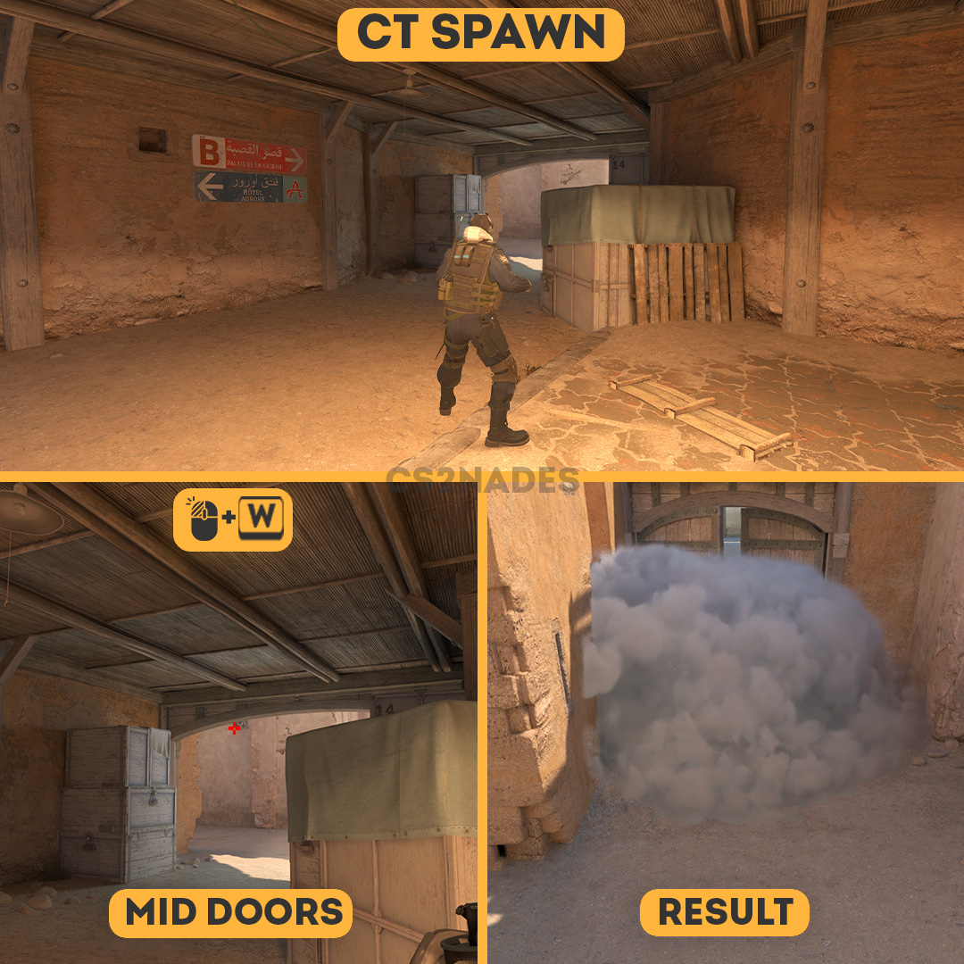 This smoke lineup from CT Spawn denies the angle at mid doors on Dust2 in CS2. On CT side, this smoke helps hold the site by cutting off key approach angles. The throw uses a running throw technique, so practice the position and timing in a private server before your match. Includes crosshair placement, video guide, and setpos command.