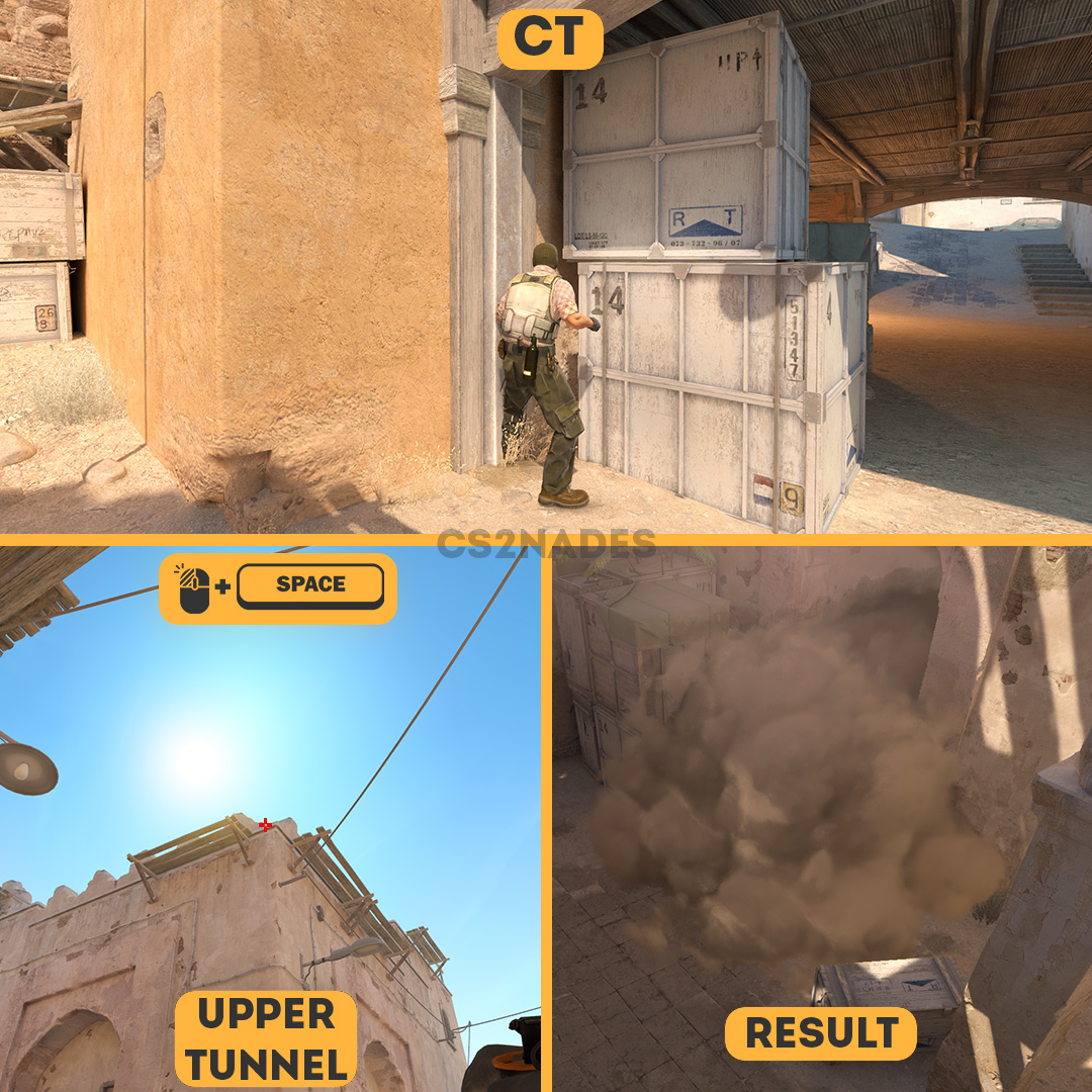 This smoke lineup from CT cuts off sightlines at upper tunnel on Dust2 in CS2. On CT side, this smoke helps hold the site by cutting off key approach angles. The throw uses a left-click + jump technique, so practice the position and timing in a private server before your match. Includes crosshair placement, video guide, and setpos command.