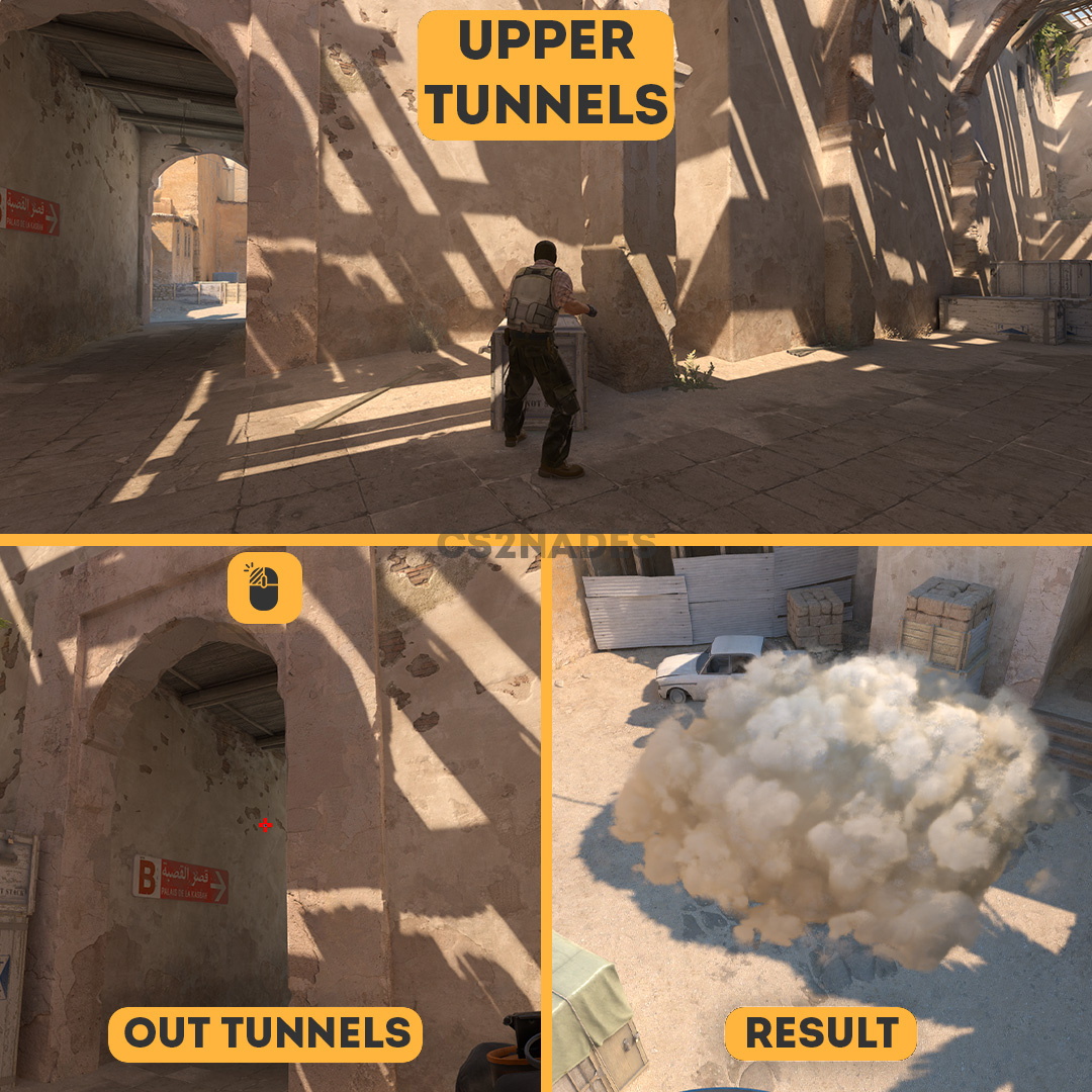 This smoke lineup from Upper Tunnels denies the angle at out tunnels 2 on Dust2 in CS2. This is a strong T-side lineup for site executes — it cuts off key sightlines and lets your team push without being spotted. The throw uses a left-click technique, so practice the position and timing in a private server before your match. Includes crosshair placement, video guide, and setpos command.