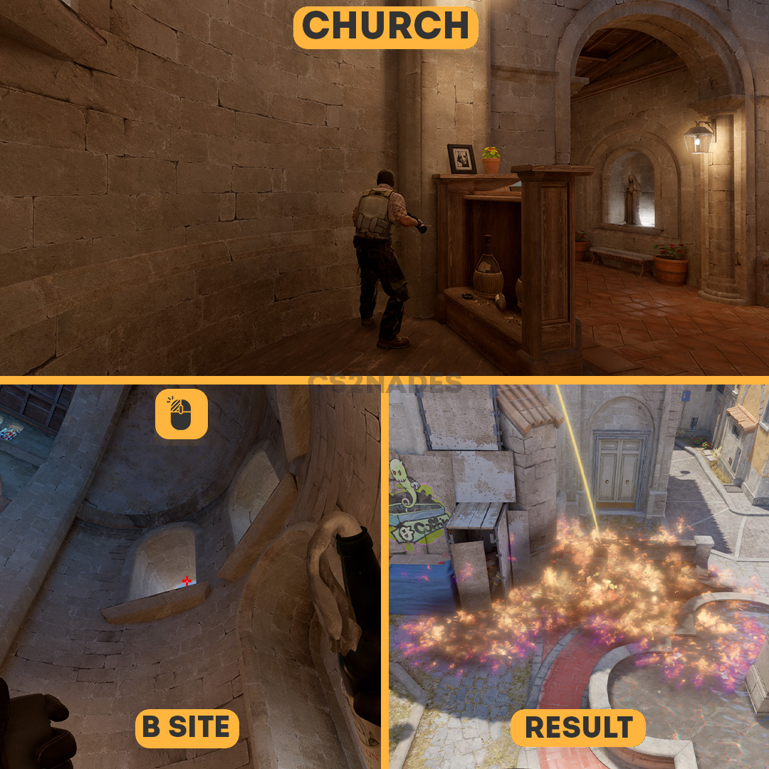 This molotov lineup from Church forces players away from B site on Inferno in CS2. For T-side plays, this molotov clears common defensive positions and forces rotations. The throw uses a left-click technique, so practice the position and timing in a private server before your match. Includes crosshair placement, video guide, and setpos command.
