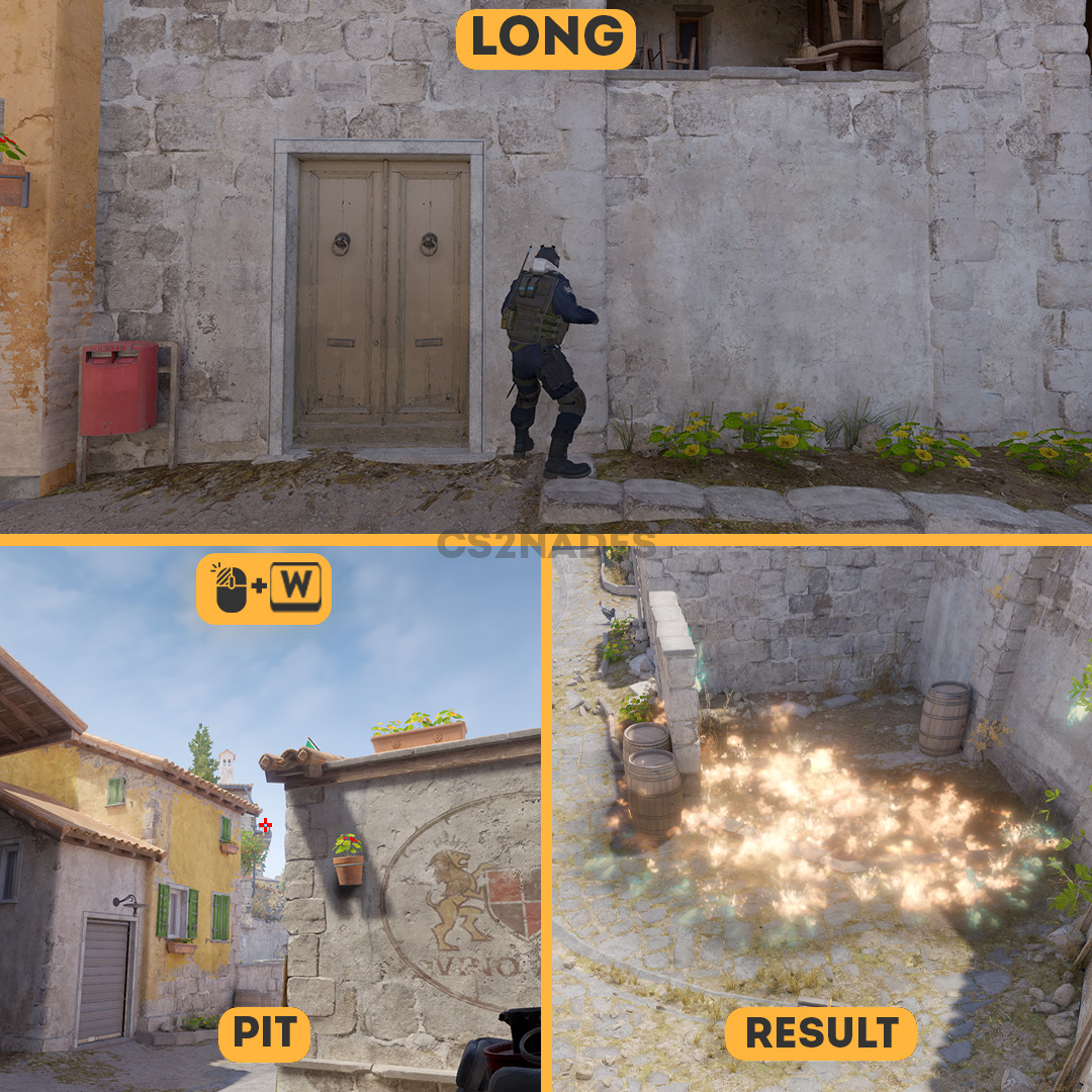 This molotov lineup from Long burns out pit on Inferno in CS2. For CT-side defense, this molotov slows down rushes and buys time for rotations. The throw uses a running throw technique, so practice the position and timing in a private server before your match. Includes crosshair placement, video guide, and setpos command.