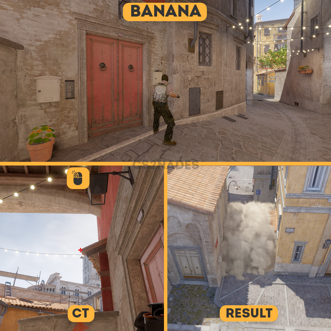 This smoke lineup from Banana cuts off sightlines at CT on Inferno in CS2. This is a strong T-side lineup for site executes — it cuts off key sightlines and lets your team push without being spotted. The throw uses a left-click technique, so practice the position and timing in a private server before your match. Includes crosshair placement, video guide, and setpos command.