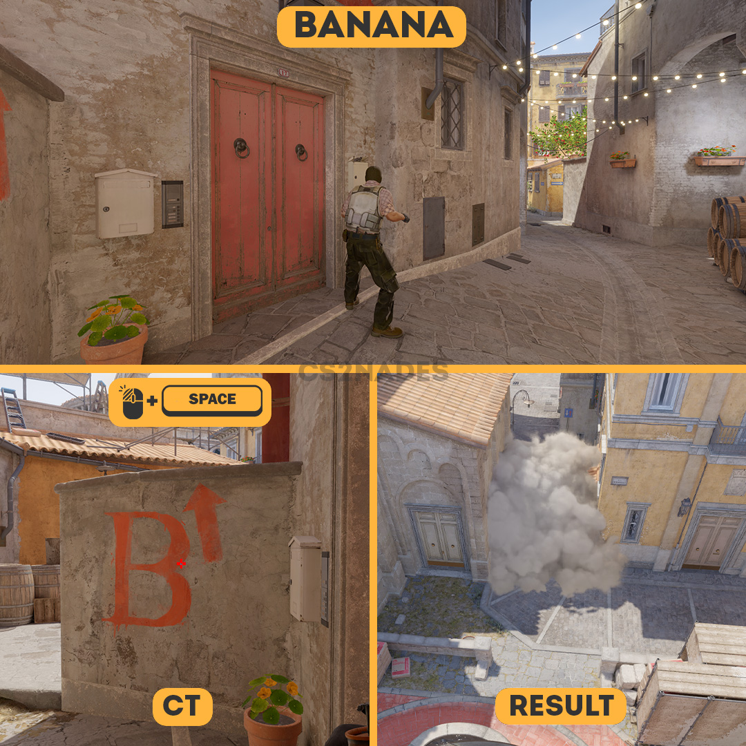 This smoke lineup from Banana denies the angle at CT 2 on Inferno in CS2. This is a strong T-side lineup for site executes — it cuts off key sightlines and lets your team push without being spotted. The throw uses a left-click + jump technique, so practice the position and timing in a private server before your match. Includes crosshair placement, video guide, and setpos command.