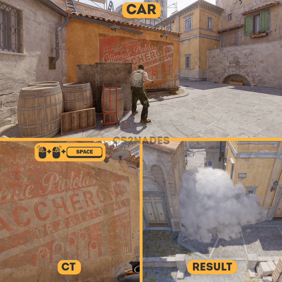 This smoke lineup from Car blocks visibility at CT on Inferno in CS2. This is a strong T-side lineup for site executes — it cuts off key sightlines and lets your team push without being spotted. The throw uses a left+right click + jump technique, so practice the position and timing in a private server before your match. Includes crosshair placement, video guide, and setpos command.