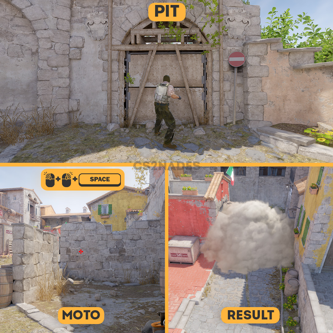 This smoke lineup from Pit cuts off sightlines at moto on Inferno in CS2. On CT side, this smoke helps hold the site by cutting off key approach angles. The throw uses a left+right click + jump technique, so practice the position and timing in a private server before your match. Includes crosshair placement, video guide, and setpos command.