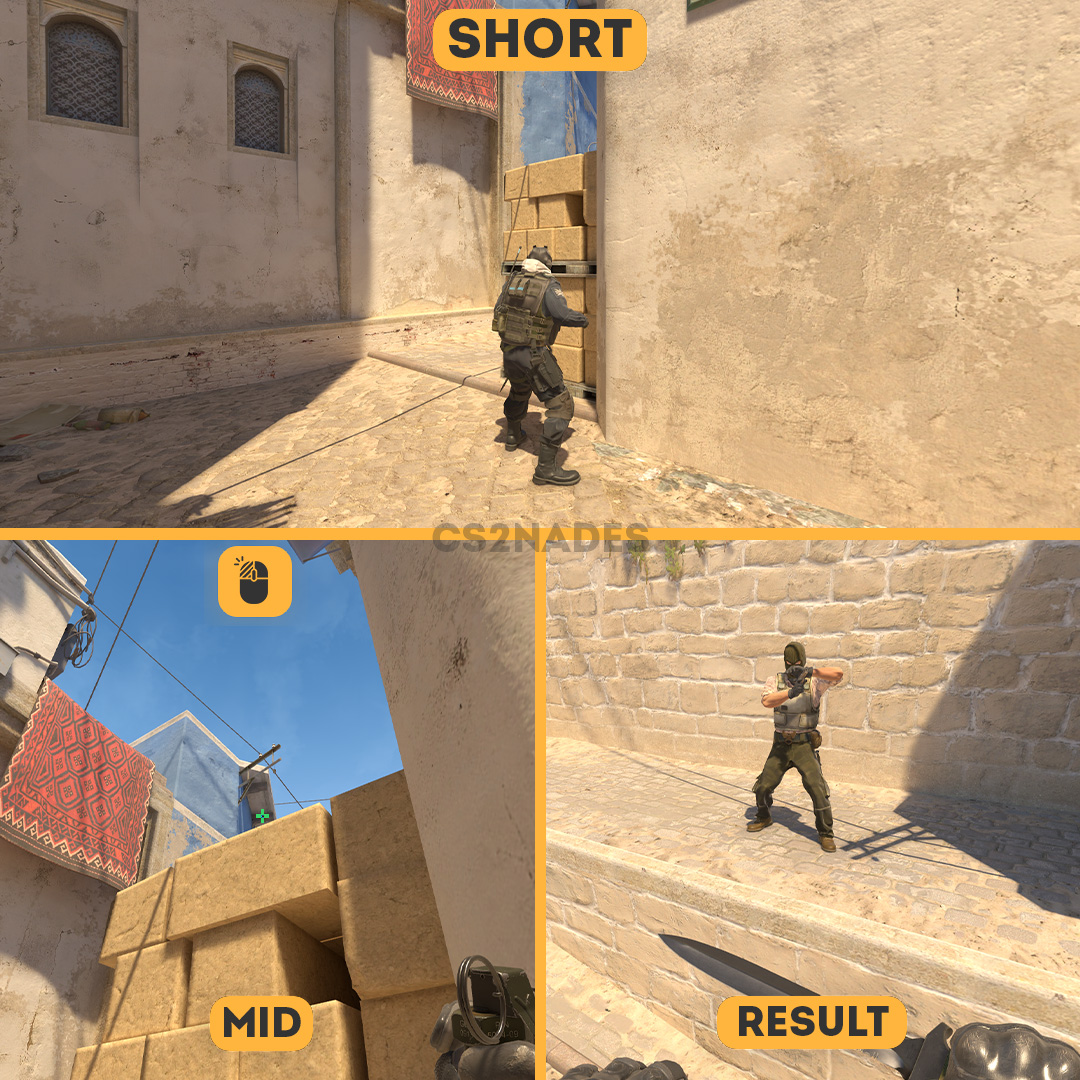 This flash lineup from Short pops at mid on Mirage in CS2. On CT side, this flash is great for retakes or aggressive peeks to catch attackers off guard. The throw uses a left-click technique, so practice the position and timing in a private server before your match. Includes crosshair placement, video guide, and setpos command.