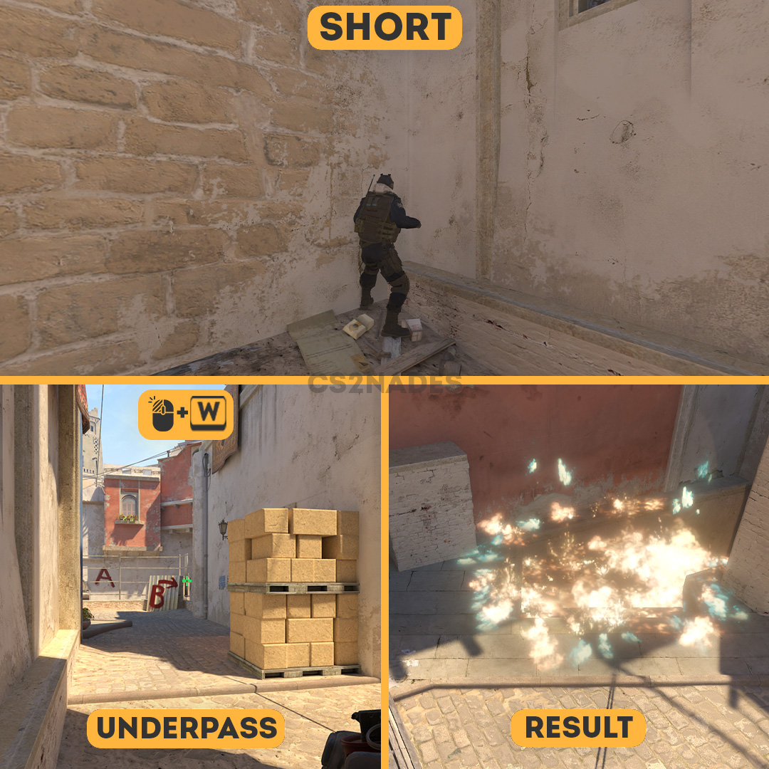 This molotov lineup from Short denies the position at underpass on Mirage in CS2. For CT-side defense, this molotov slows down rushes and buys time for rotations. The throw uses a running throw technique, so practice the position and timing in a private server before your match. Includes crosshair placement, video guide, and setpos command.