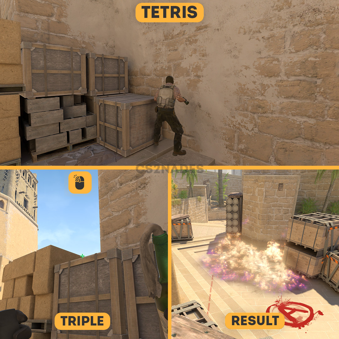 This molotov lineup from Tetris burns out triple on Mirage in CS2. For T-side plays, this molotov clears common defensive positions and forces rotations. The throw uses a left-click technique, so practice the position and timing in a private server before your match. Includes crosshair placement, video guide, and setpos command.