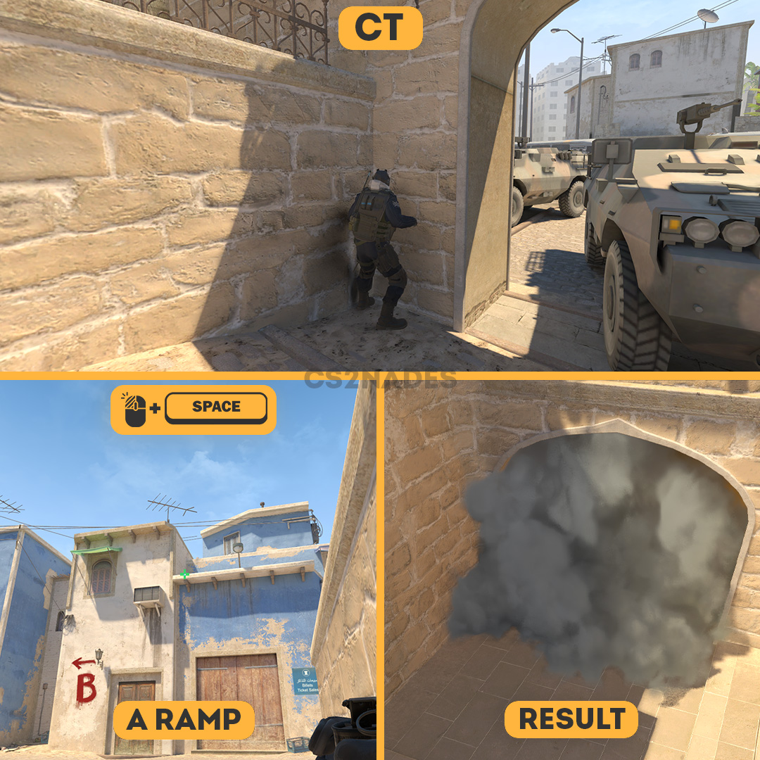 This smoke lineup from CT denies the angle at A ramp on Mirage in CS2. A strong early smoke against fast or default A rounds. Slows the A Ramp hit and breaks the attackers’ timing. Forces Ts either to wait or to push through smoke into a risky fight.