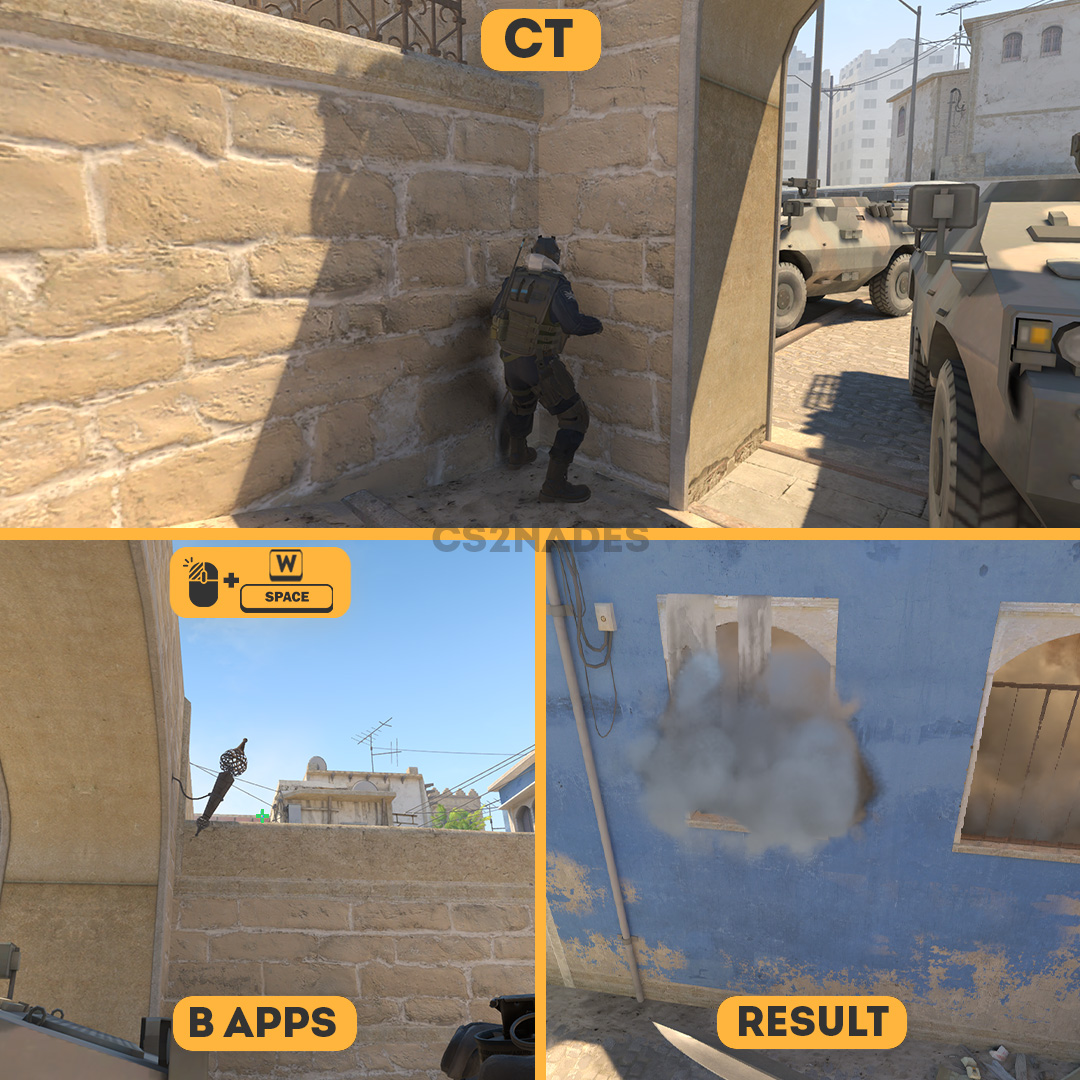 This smoke lineup from CT covers B apps on Mirage in CS2. Useful when the B anchor does not want to fight apartments instantly and prefers delay. Another early B delay option that cuts the path into apartments and breaks the attack timing. Useful if the B defense is playing more passively.