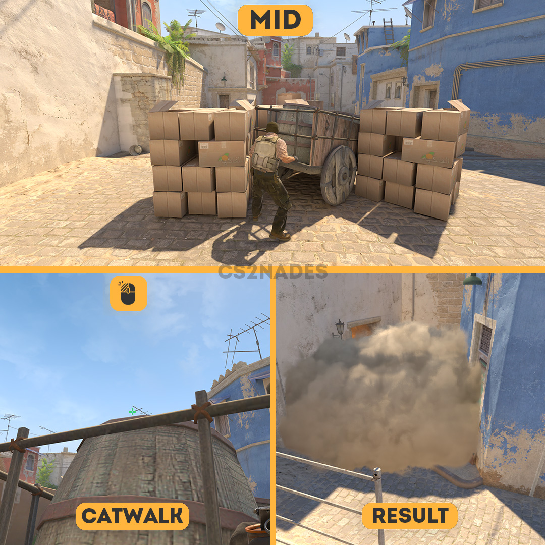 This smoke lineup from Mid blocks visibility at catwalk on Mirage in CS2. This is a strong T-side lineup for site executes — it cuts off key sightlines and lets your team push without being spotted. The throw uses a left-click technique, so practice the position and timing in a private server before your match. Includes crosshair placement, video guide, and setpos command.