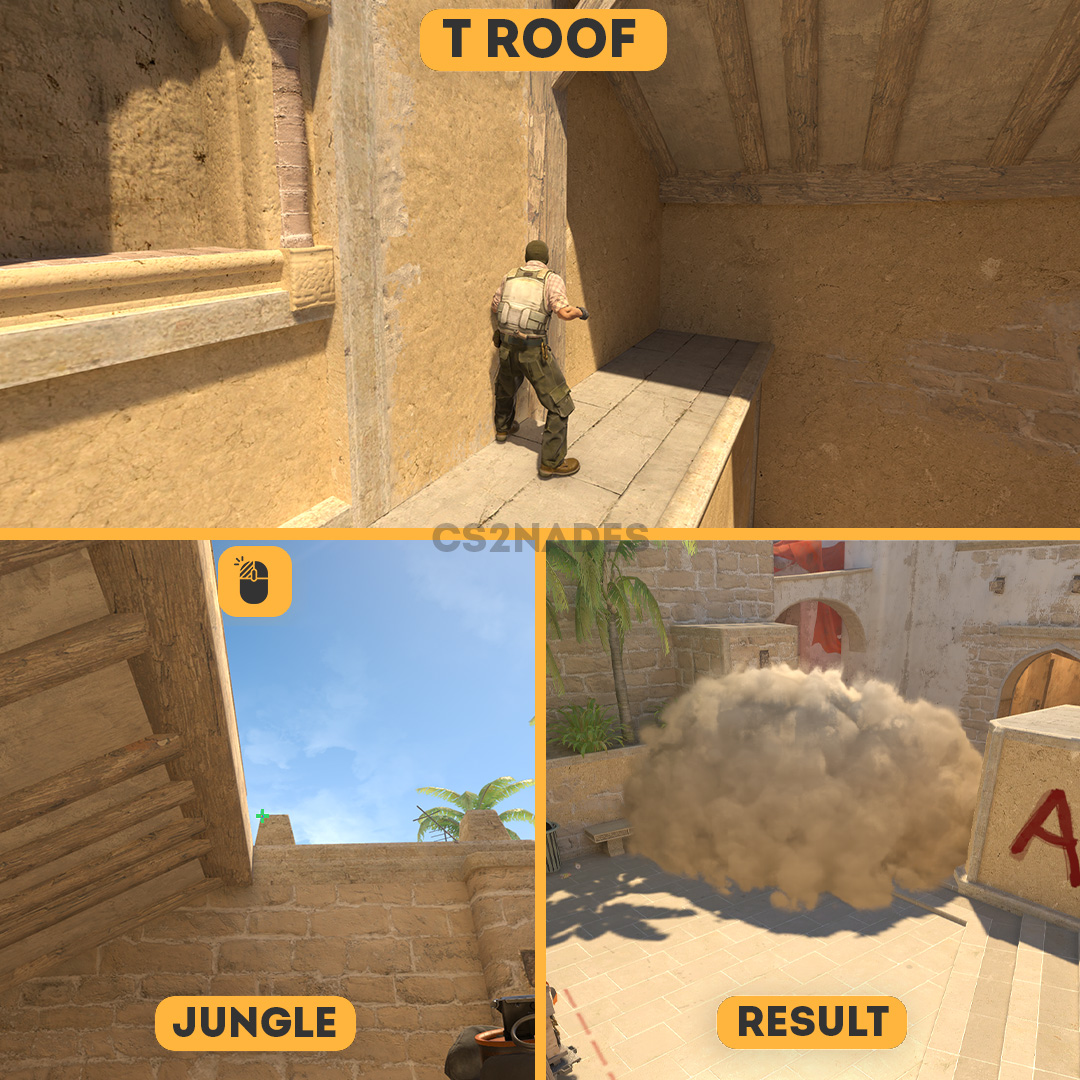 This smoke lineup from T Roof denies the angle at jungle on Mirage in CS2. This is a strong T-side lineup for site executes — it cuts off key sightlines and lets your team push without being spotted. The throw uses a left-click technique, so practice the position and timing in a private server before your match. Includes crosshair placement, video guide, and setpos command.