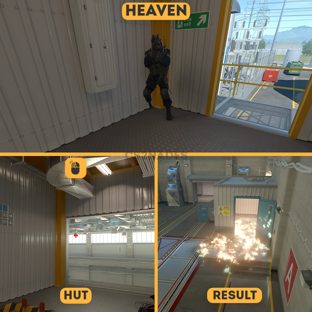 This molotov lineup from Heaven denies the position at hut on Nuke in CS2. For CT-side defense, this molotov slows down rushes and buys time for rotations. The throw uses a left-click technique, so practice the position and timing in a private server before your match. Includes crosshair placement, video guide, and setpos command.