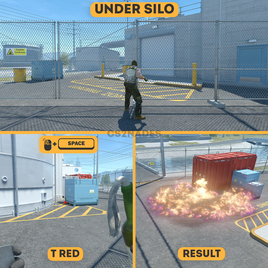 This molotov lineup from Under Silo clears T red 2 on Nuke in CS2. For T-side plays, this molotov clears common defensive positions and forces rotations. The throw uses a left-click + jump technique, so practice the position and timing in a private server before your match. Includes crosshair placement, video guide, and setpos command.