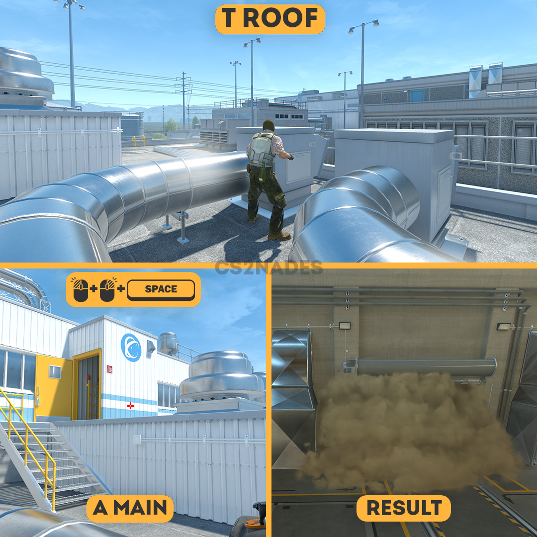 This smoke lineup from T Roof covers A main 2 on Nuke in CS2. This is a strong T-side lineup for site executes — it cuts off key sightlines and lets your team push without being spotted. The throw uses a left+right click + jump technique, so practice the position and timing in a private server before your match. Includes crosshair placement, video guide, and setpos command.