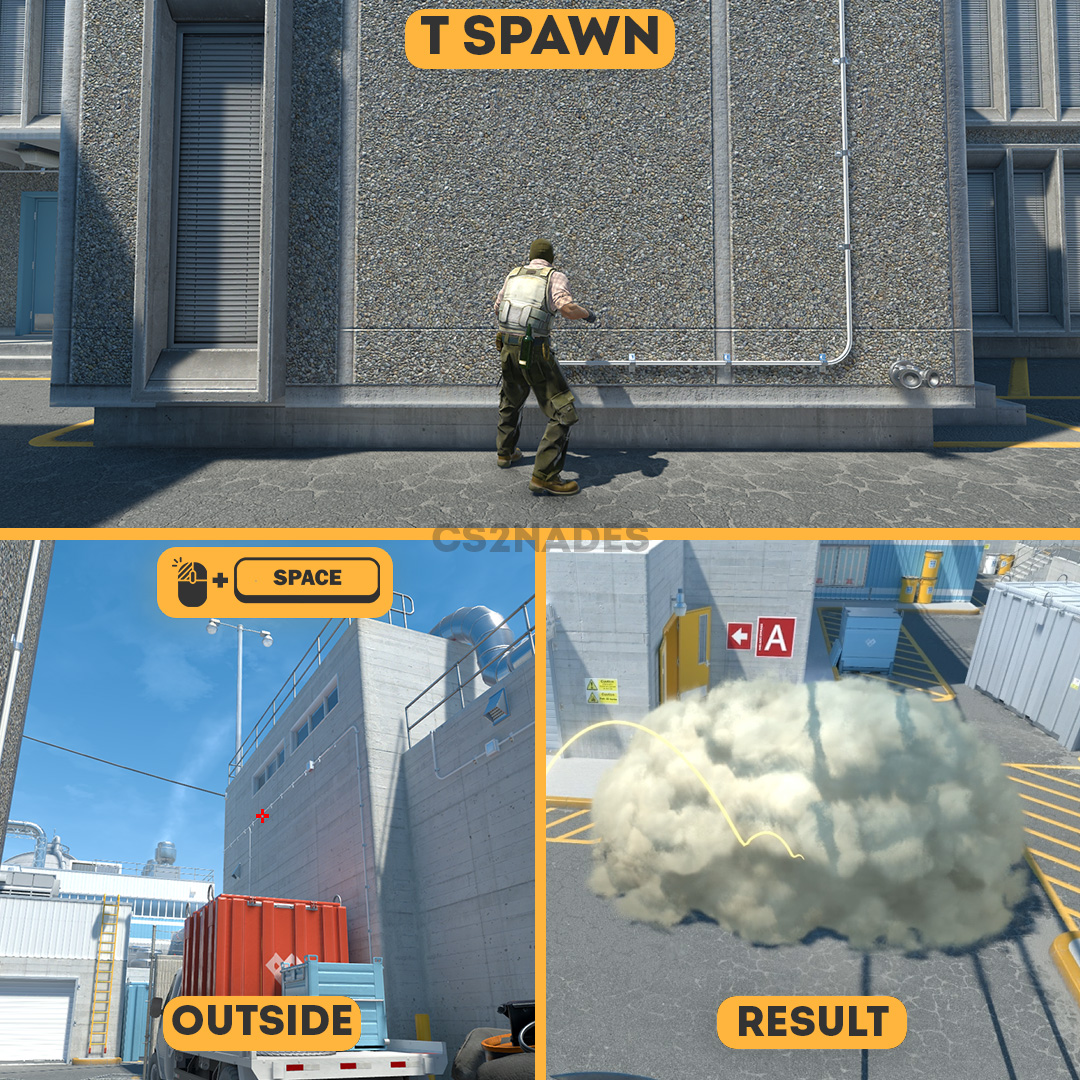 This smoke lineup from T Spawn cuts off sightlines at outside on Nuke in CS2. This is a strong T-side lineup for site executes — it cuts off key sightlines and lets your team push without being spotted. The throw uses a left-click + jump technique, so practice the position and timing in a private server before your match. Includes crosshair placement, video guide, and setpos command.