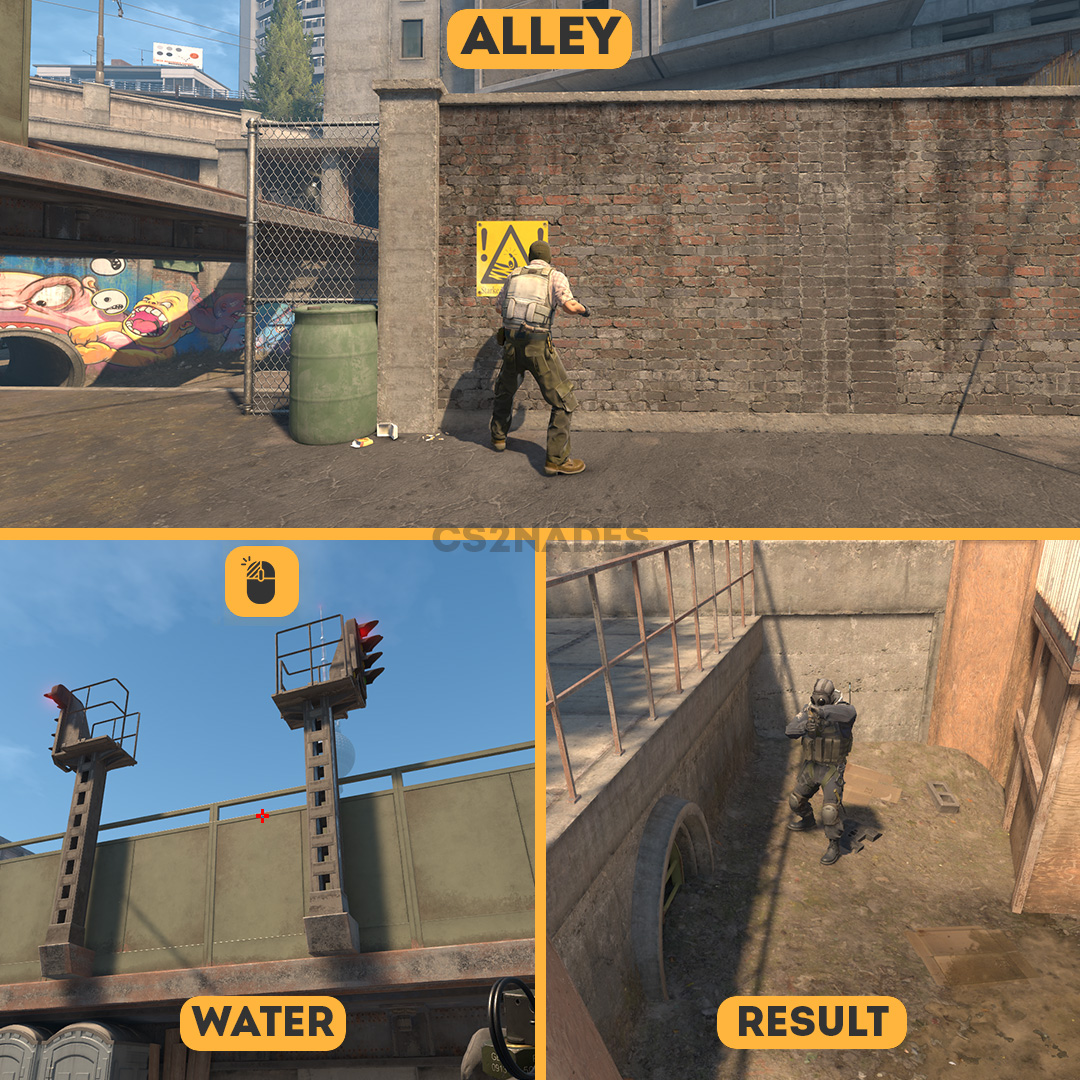 This flash lineup from Alley pops at water on Overpass in CS2. On T side, use this flash to entry-frag or support a teammate pushing into position. The throw uses a left-click technique, so practice the position and timing in a private server before your match. Includes crosshair placement, video guide, and setpos command.